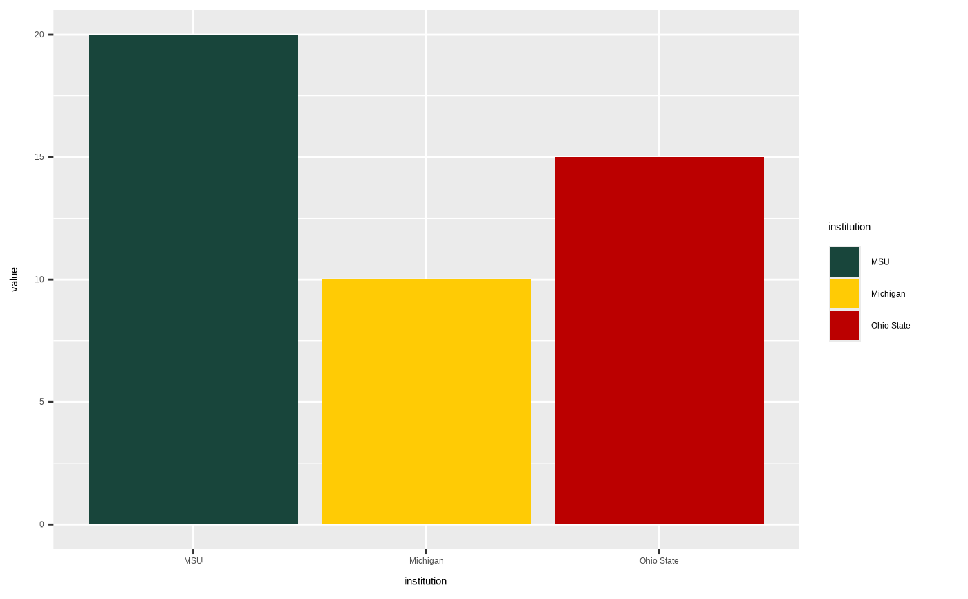my_colors <- get_bigten_colors(c("Michigan", "Ohio State", "MSU"))