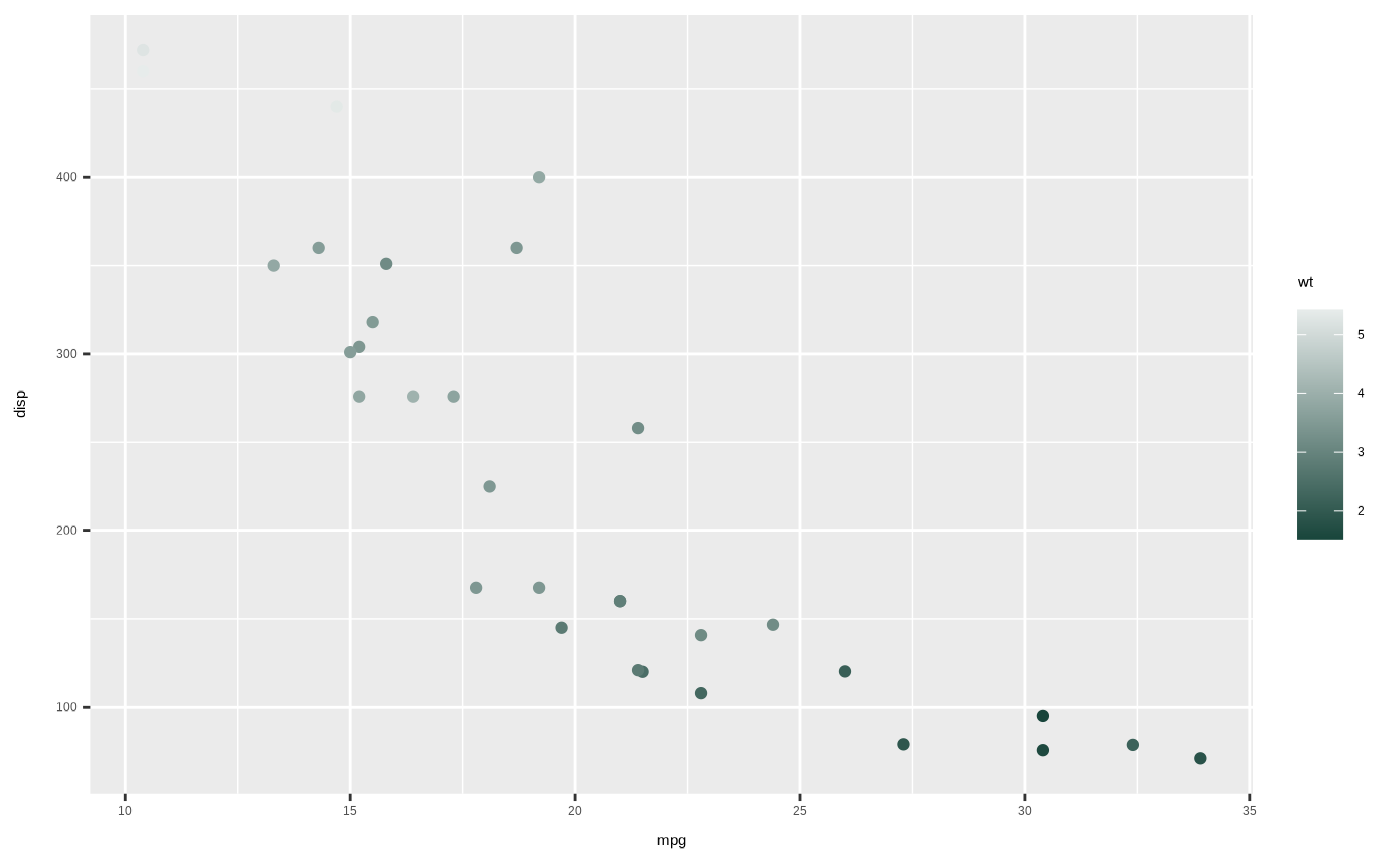 ggplot(data = mtcars, aes(x = mpg, y = disp, color = wt)) +